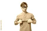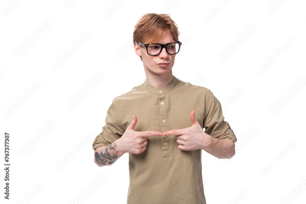 close-up portrait of a stylish european guy with red hair dressed in a fashionable brown shirt and trousers on a white background. people lifestyle concept