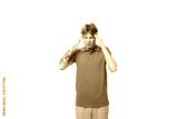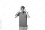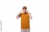 young smart guy with red hair stands thoughtfully on a white background with copy space