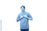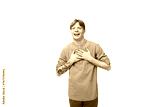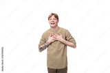 young emotional European man with red golden hair is dressed in a light brown shirt on a white background
