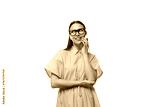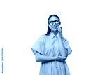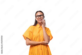 european young brunette lady wearing an orange summer dress and glasses smiling cutely on a white background
