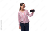 young lady office employee dressed in pink white blouse and jeans shows smartphone screen with mockup