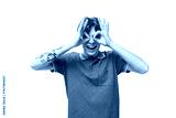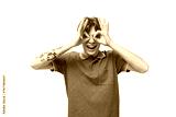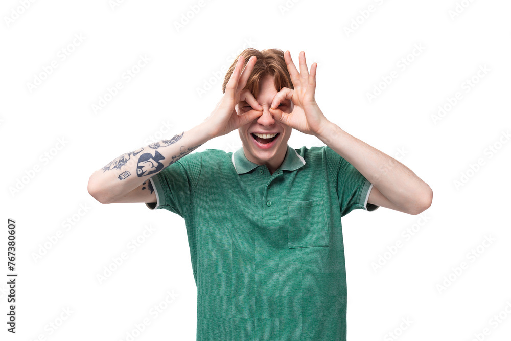 a young slender ginger man with a tattoo on his arm, dressed in a green T-shirt with bright facial expressions