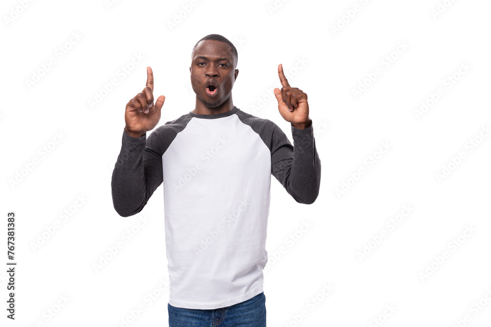 a young American guy with a short haircut, dressed in a long-sleeve sweater, tells the news with surprise