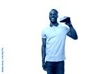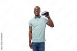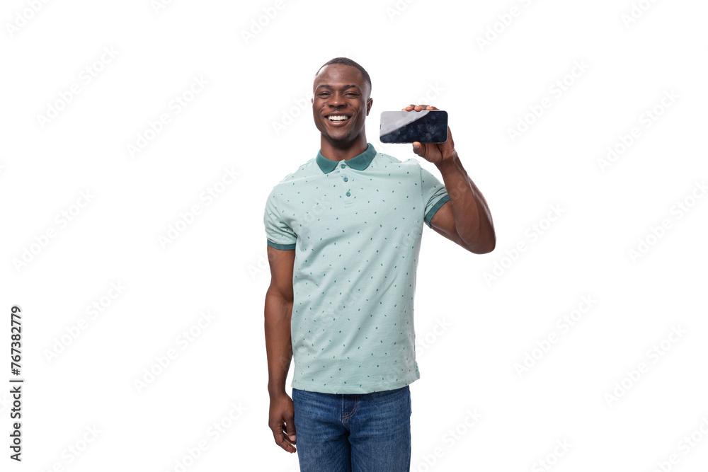 young african man dressed casually showing smartphone screen with mockup standing on white background with copy space