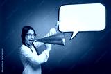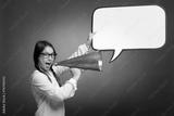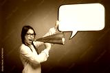 young girl shouting with an old megaphone on a gray background
