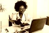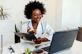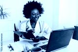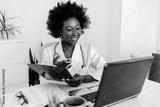 Head shot of woman wearing white coat stethoscope on shoulders looking at camera, doctor make video call interact through internet talk with patient provide help online counseling and therapy concept
