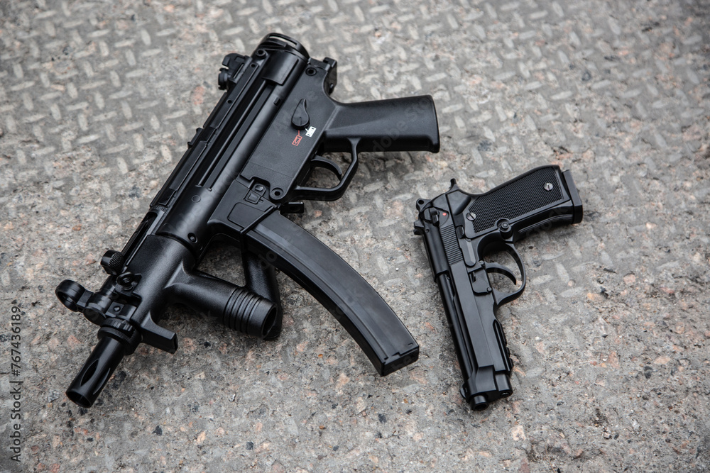 Air gun. Modern pneumatic weapon for air soft, sports and entertainment. A dummy, a copy of a real pistol. Gray concrete back