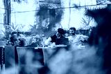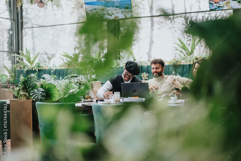 Multiethnic business colleagues working together with a laptop in a lush cafe setting, displaying teamwork and cooperation in a casual environment.