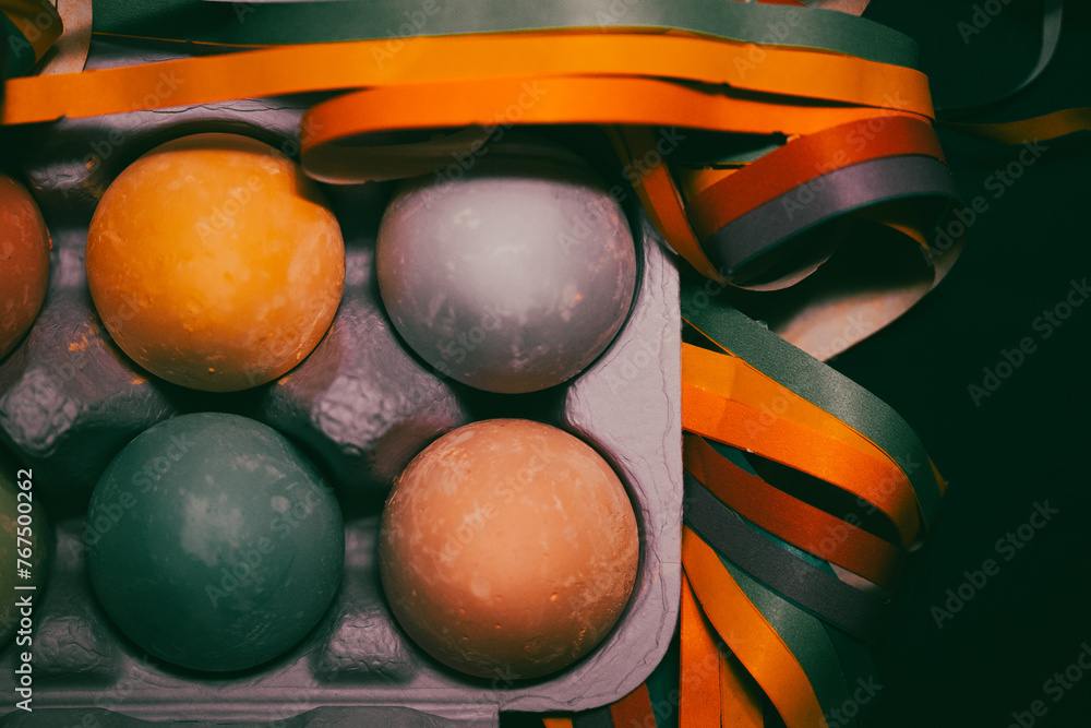 Collection of beautifully painted Easter eggs nestled in a violet box flatly. Egg decorating. LGBT gay vibrant colors greeting card. Festive wallpaper