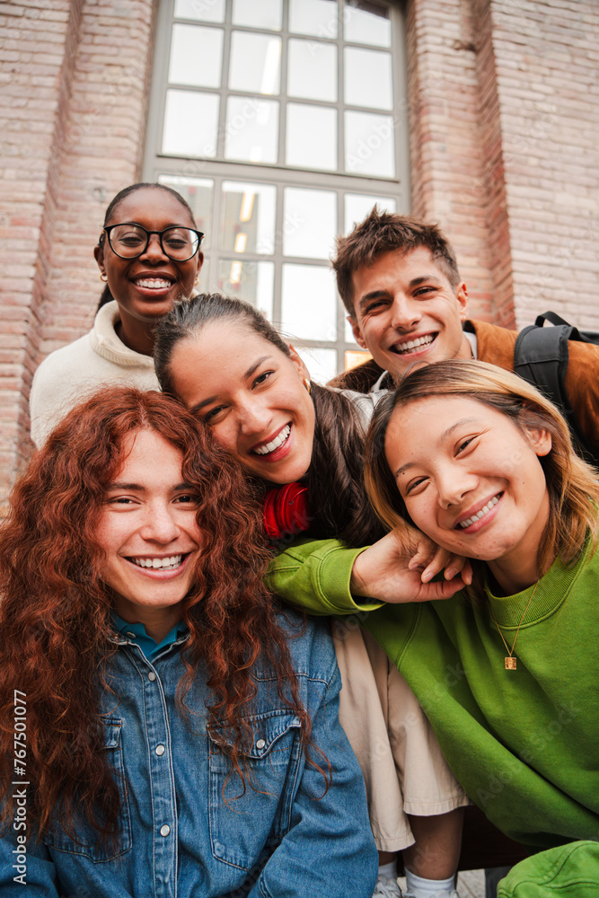 Vertical portrait of a group of friends having fun and smiling together. High school students looking at camera with happy expression. Young friendly real people staring front posing for a photo