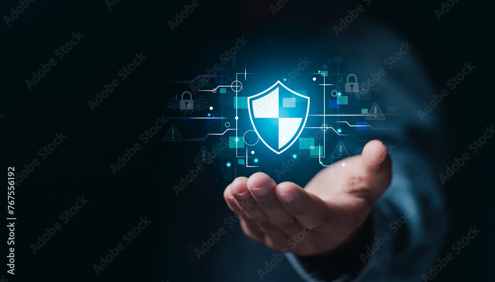 Cybersecurity and privacy concepts to protect data. Businessman holding cyber security technology on virtual screen for protecting personal data and secure internet access.
