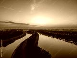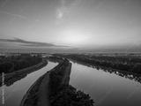 Captured at twilight, this serene aerial image presents a meandering river flowing gently past a small riverside community. The placid water reflects the soft colors of the sunset sky, ranging from