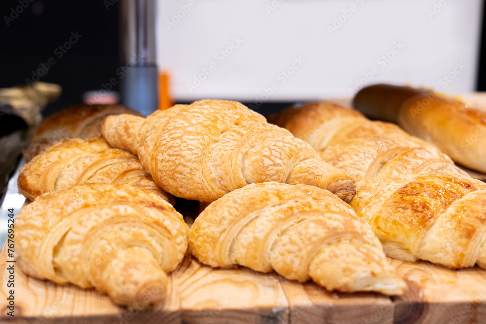 Close-up of freshly baked pastry products displayed in a bakery. Fresh croissant