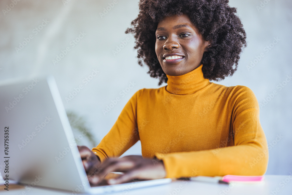 African black business woman working on laptop at office. Smiling mature african american businesswoman lookingup at copy space while working on phone.
