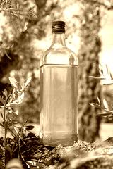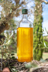 Bottle of olive oil is on olive tree branch in the garden. Blurred nature background.