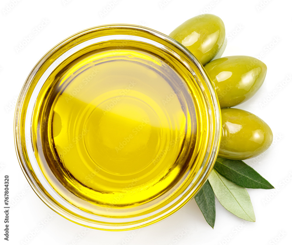Glass bowl of olive oil and olive berries isolated on white background. Top view.