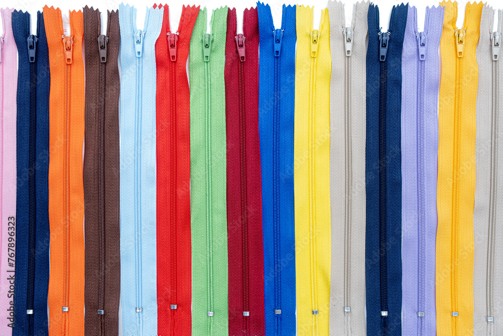 Multicolored Zippers or Zip Fasteners used for binding fabric or textile
