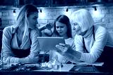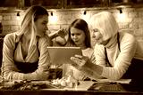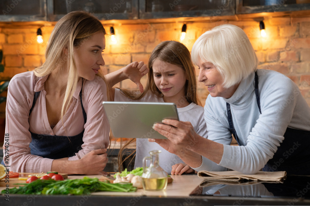 Horizontal shot of little girl that don't like recipe that grandmother and mother showing her in the tablet in kitchen. Women looking what cook for dinner in pad, choosing healthy vegan ingredients