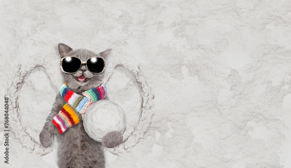 Happy cat wearing sunglasses and warm winter woolen knitted scarf holds big snowball while lying on snow. Empty space for text