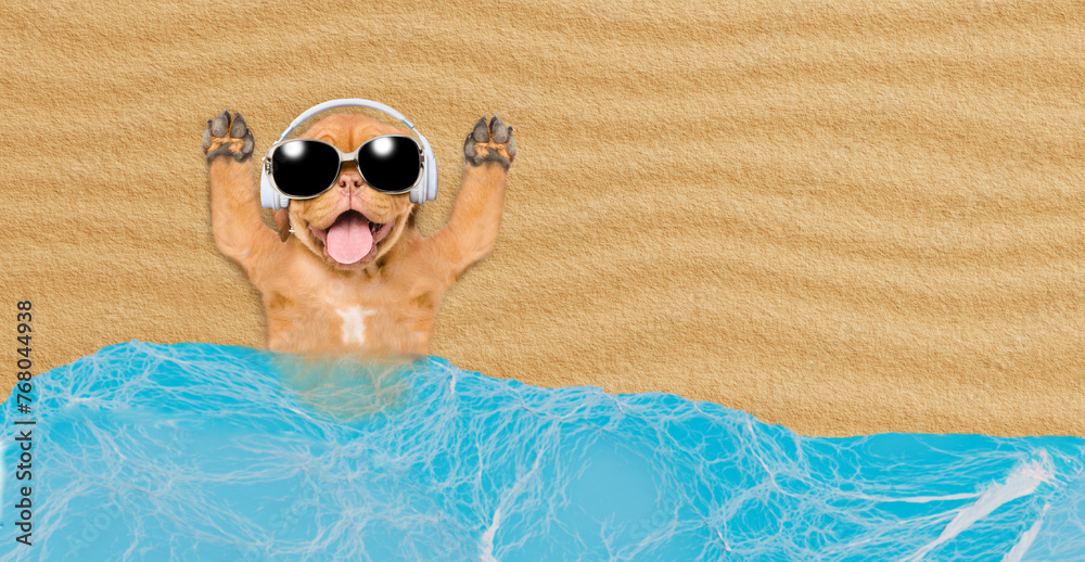 Happy Mastiff mastiff puppy wearing sunglasses headphones lying at sunny beach. Empty space for text