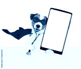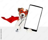 jack russell terrier wearing like a doctor with superhero cape and with stethoscope on his neck shows big smartphone with white blank screen in it paw above empty banner. Isolated on white background