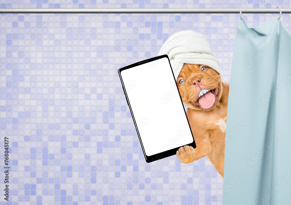 Happy mastiff puppy with towel on it head, with big funny teeth peeking out from behind the shower curtain in the bathroom at home and holds big smartphone with empty screen in it paw
