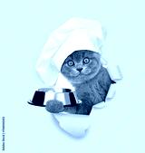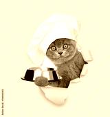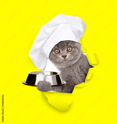 Cat wearing chef's hat looking through the hole in yellow paper and holding empty bowl. isolated on white background