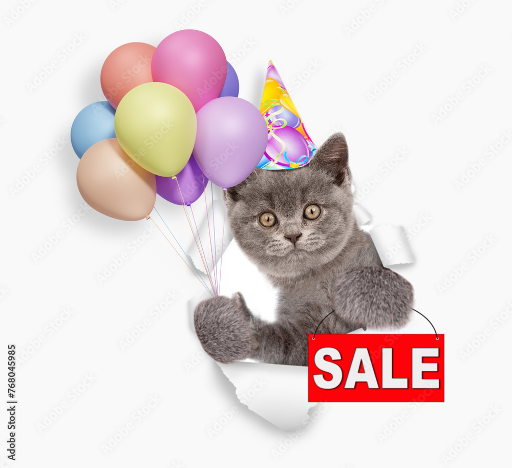 Funny kitten wearing party cap looks through a hole in white paper, holding balloons and showing signboard with labeled "sale"