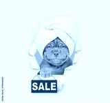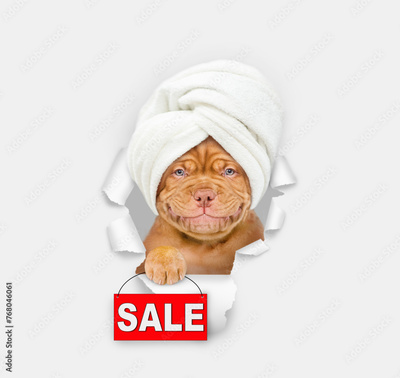 Smiling Mastiff puppy with towel on it head looking through a hole in white paper and showing signboard with labeled "sale"