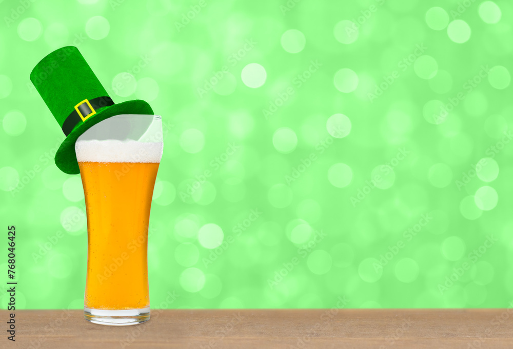 Glass of light beer with leprechauns green top hat on green blurred background. Saint Patrick's Day Concept. Empty space for text