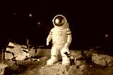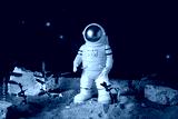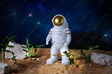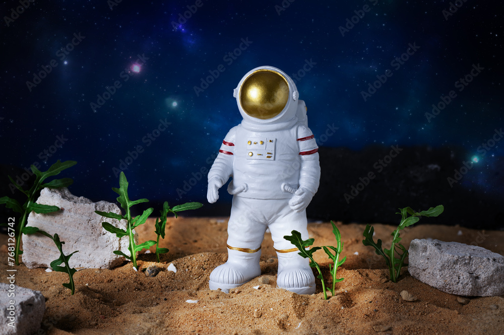 Agriculture technologies in space concept. Astronaut growing plants on alien planet. Since fiction, imagination about gardening on mars planet.
