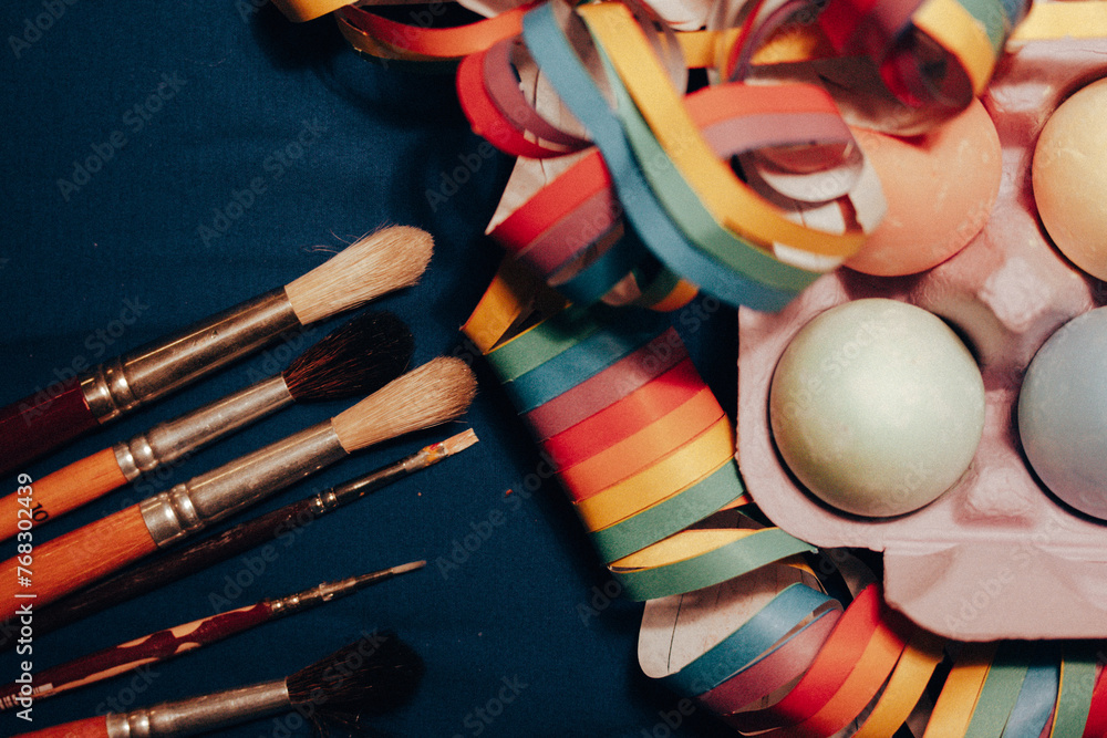 Creative festive holiday background. Painted Easter eggs, paint brushes, colorful tinsel for decor lying on table top view Spring holidays preparation