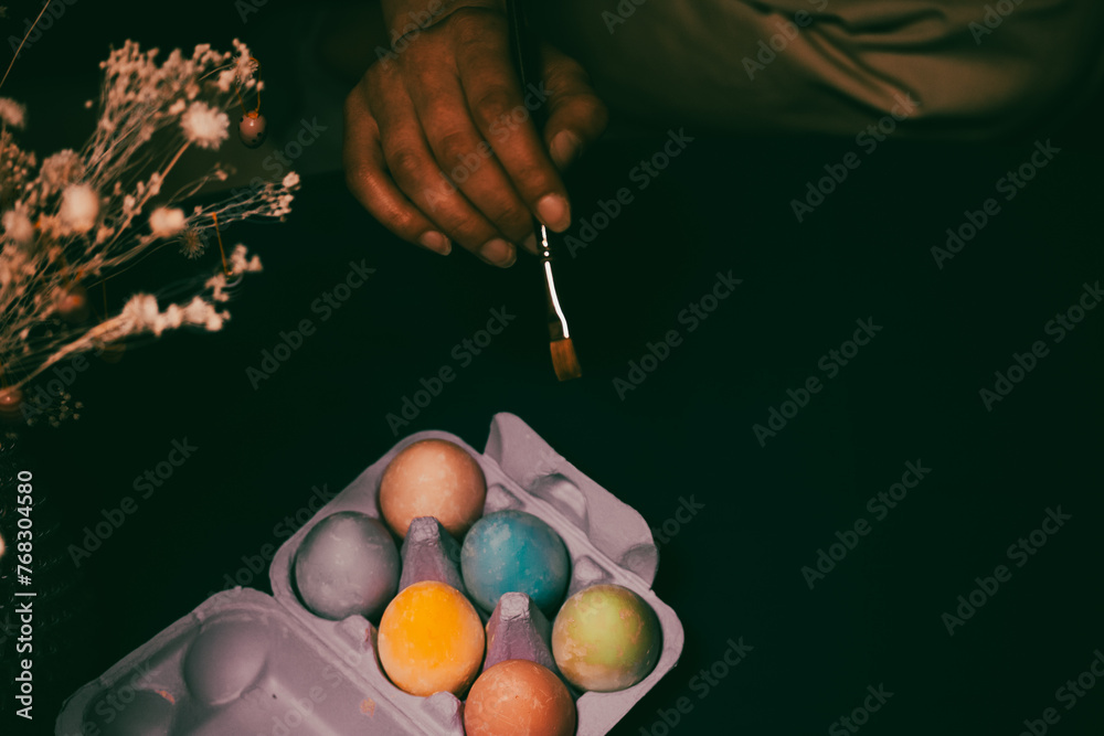 Colorful painted Easter eggs in a violet box, a paint brush in woman's hands. Vibrant colors. Festive greeting card. Open egg box on dark background.