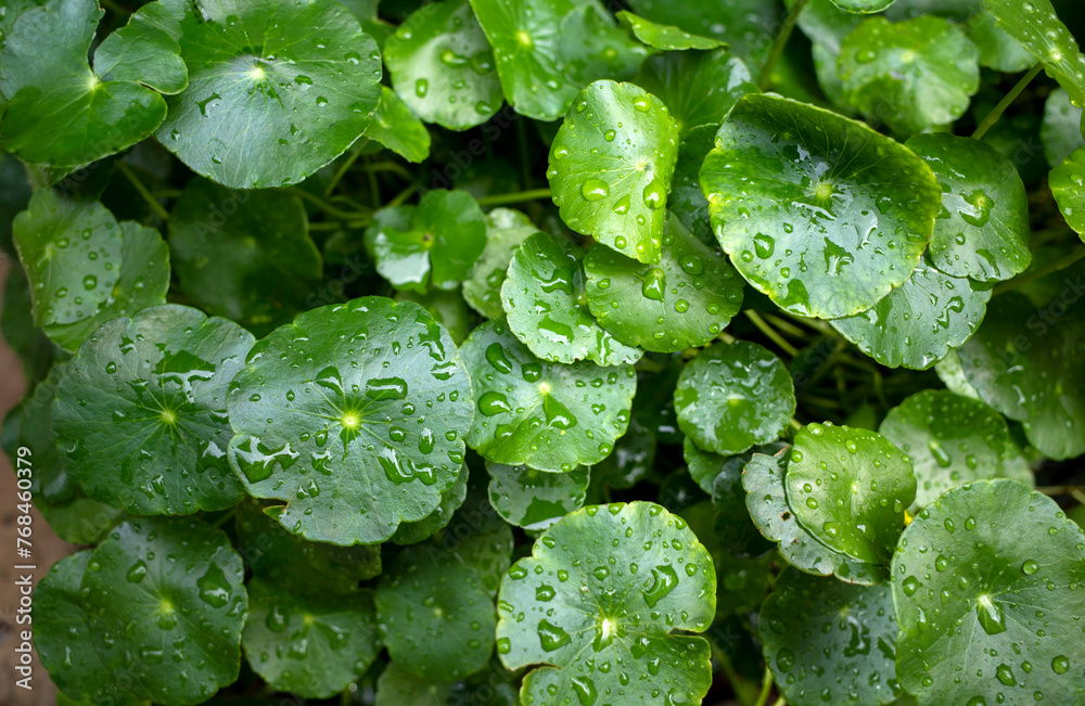 Close up of Daun Pegagan, Centella asiatica leaves with water splash