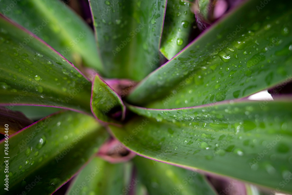 Close up of Tradescantia spathacea Swartz plant, Boat-lily or Oyster Lily in the garden with water splash