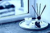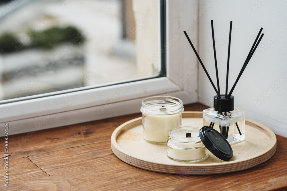 Scented Candles and Diffuser on a Wooden Tray by the Window