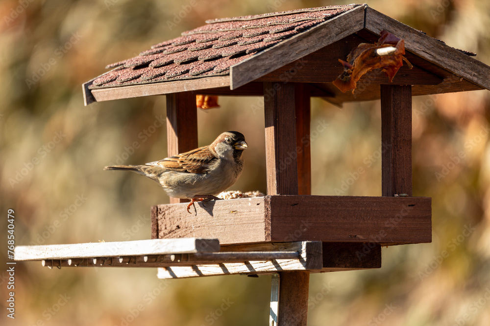 House sparrow (Passer domesticus) in bird feeder in winter garden, bird of the sparrow family Passeridae. European bird wildlife, Czech republic