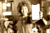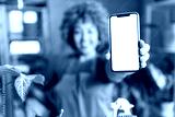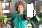 Mature smiling woman gardener showing a mobile phone screen towards camera. Mobile phone apps for home gardening