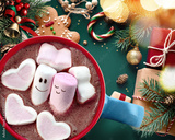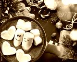 Merry Christmas composition with Marshmallows couple in mug with hot chocolate