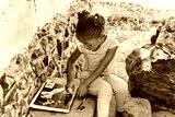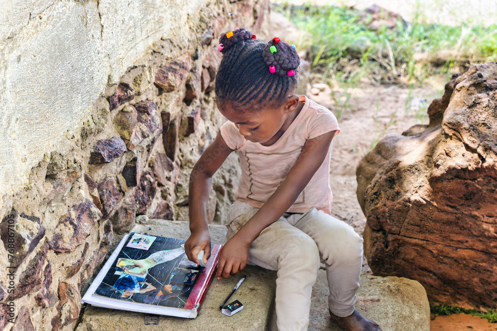 back to school, single african girl with braids hairstyle in a village, she is handwriting in a notebook