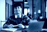 Happy student learning in classroom and looking at camera.
