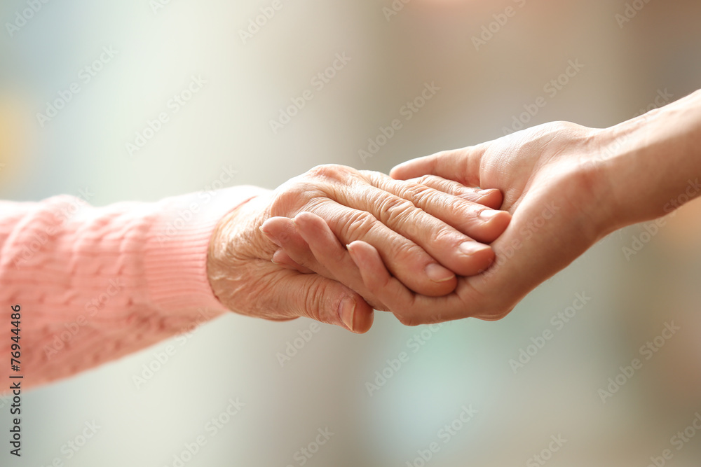 Old and young holding hands on light background, closeup