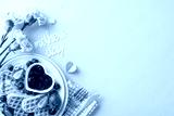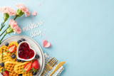 Mother's Day morning meal: top view heart-shaped waffles, strawberries, blackberries, jam, fork and spoon, napkin, flowers, greeting "mothers day," on a soft blue backdrop, space for text