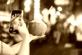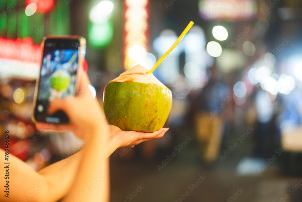 Woman hand holding coconut fresh juice at chinatown street food asia night market