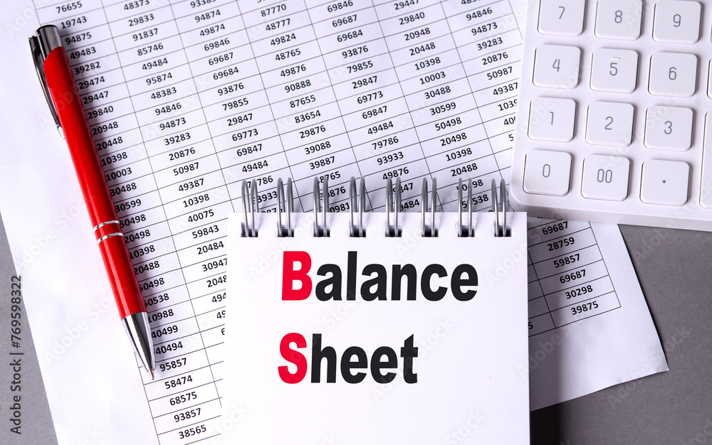 BALANCE SHEET text on notebook with chart , pen and calculator