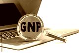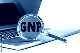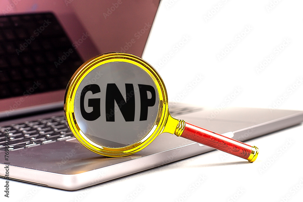 GNP word on magnifier on laptop , white background