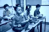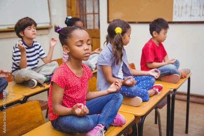 Mixed race pupils meditating in lotus position on desk in classroom