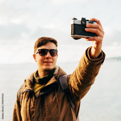 Smiling man takes photographs self portrait on coastline