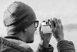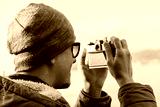 Hipster man takes photographs with vintage photo camera