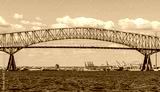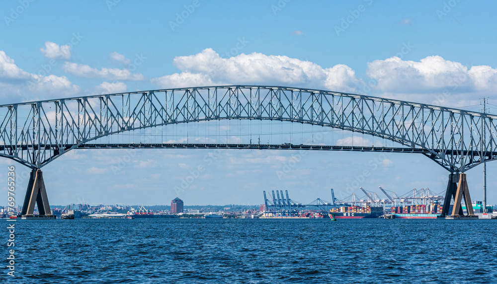 Francis Scott Key Bridge - Baltimore, Maryland USA - Patapsco River - Cargo Ships and Baltimore Cityscape in Background